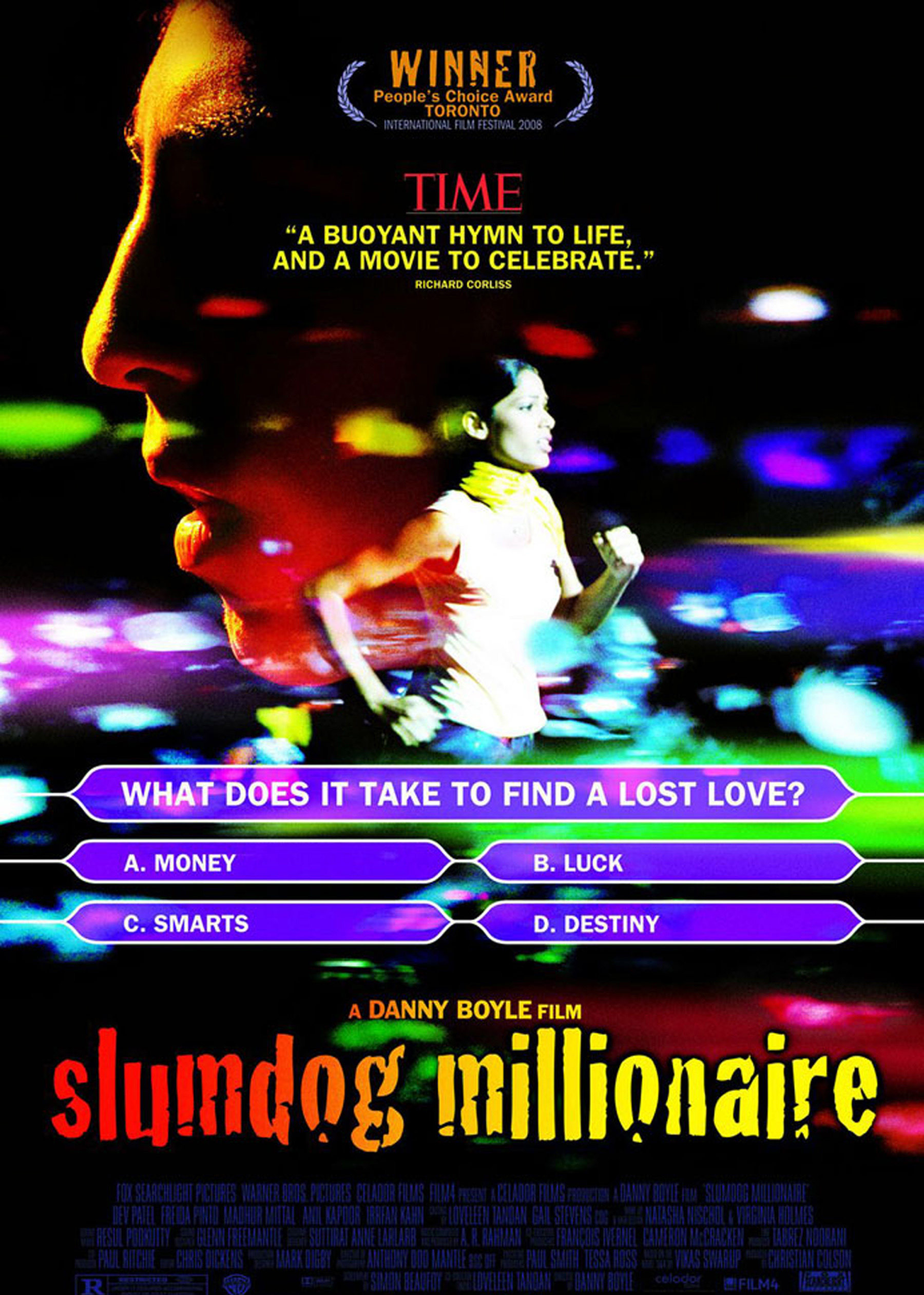 2006年,印度孟买。 印度青年杰玛•马利克还差一个问题就能赢得2千万卢比。他是怎么做到的?A:他作弊;B:他幸运;C:他是天才;D:一切命中注定。 这是《谁想成为百万富翁》电视猜谜节目的人生版。杰玛•马利克在已经赢得1千万卢比的情况下被警方以欺诈罪逮捕,严刑拷问下杰玛说出他获得1千万卢比的真相——他确实知道答案,但他只知道这些! 出身贫民窟的杰玛年幼就生活艰苦,他与哥哥沙里姆、少女拉媞卡三人却一起经历了几十年印度的变迁。之前每一个问题,都好像是杰玛的记忆碎片,牵动他关于亲情、爱情与人生的回忆。 而现在,杰玛一方面要洗清自己的犯罪嫌疑,一方面要拯救与拉媞卡的爱。在金钱与爱之前,杰玛能够沉着冷静,选择出正确的答案吗?
